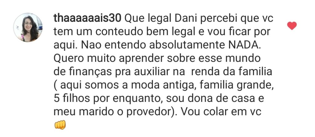 Depois de enfrentar diversos desafios financeiros, decidi que não queria ser apenas mais uma brasileira endividada. Desde 2017, venho me dedicando ao estudo do mercado financeiro, lendo best-sellers da área, assistindo a vídeos e documentários, e aprofundando meus conhecimentos com grandes especialistas do setor.